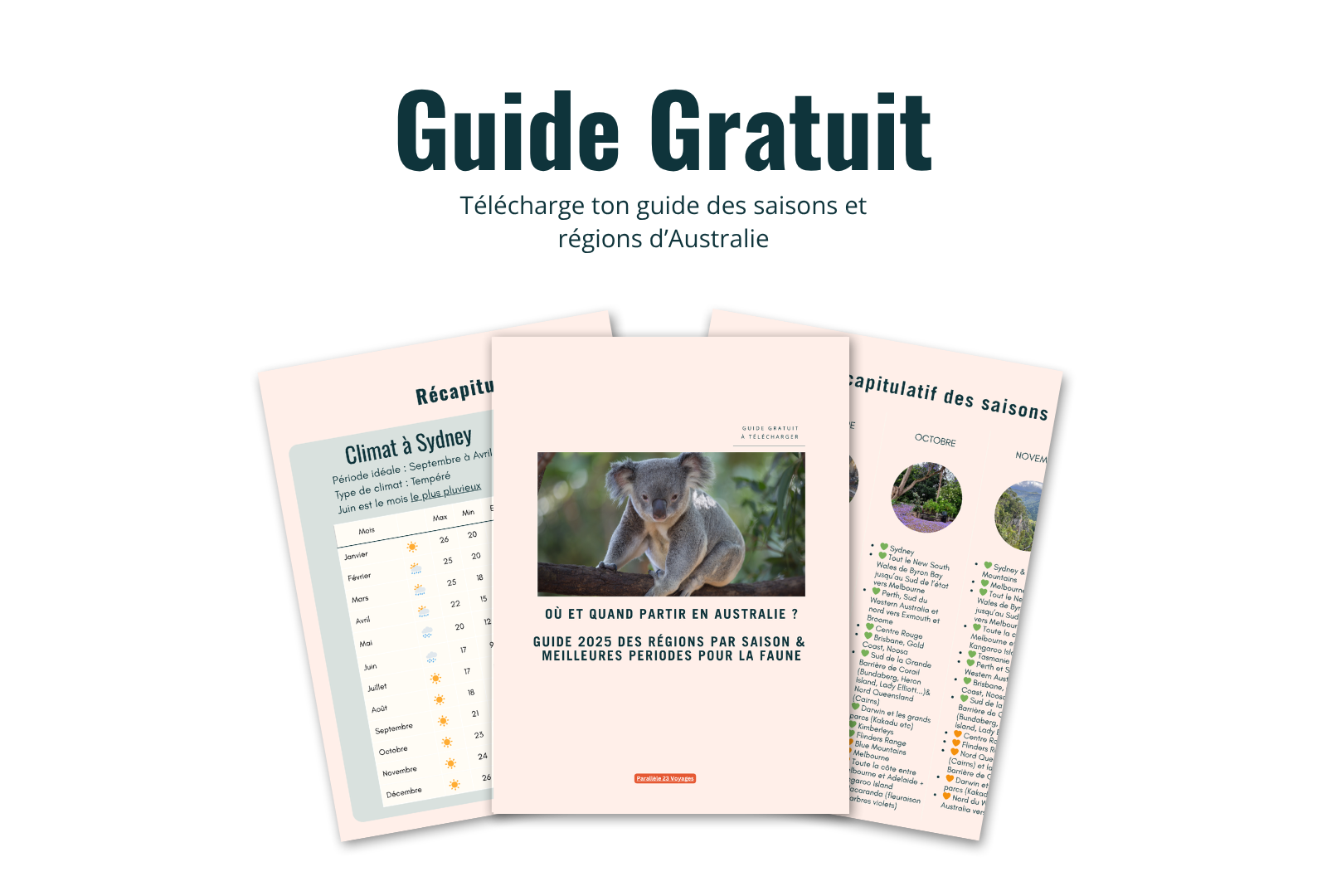 Mais voilà : un tel voyage ne s’improvise pas. Les distances sont immenses, les saisons varient d’une région à l’autre, et il est facile de se perdre dans les infos contradictoires. C’est pour ça que j’ai créé ce guide sur l’Australie gratuit : pour t’aider à poser les bases de ton itinéraire, choisir le bon moment pour partir, et organiser ton projet sans te prendre la tête.